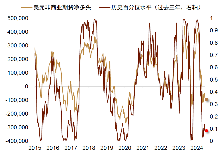 图表:美元非商业期货净多头头寸降至过去三年10%分位数以下