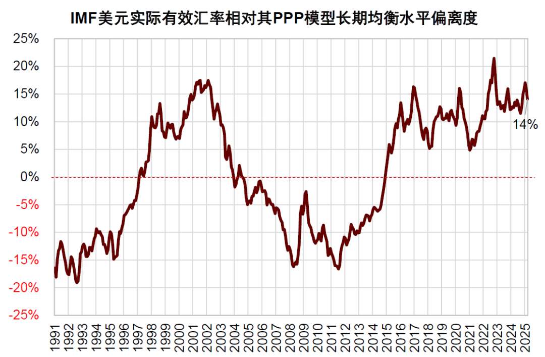 图表:IMF美元实际有效汇率(REER)相对其长期均衡水平高估14%