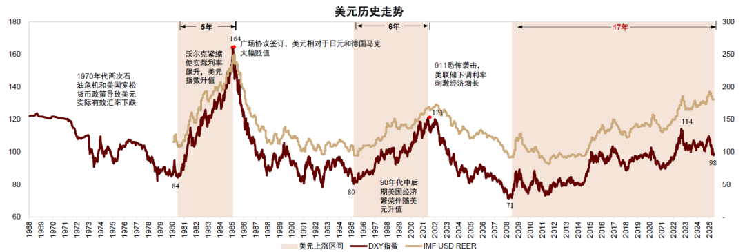 当前的第三轮美元升值周期,始于2008年金融危机。美元指数在2008年7月曾跌至71的低点,但随着金融危机全面爆发,具有避险属性的美元显著走强。到2017年特朗普上台时,美元指数已接近110。按照历史规律,美元的升值或贬值周期一般持续5至7年。若以2008年为起点,至2017年本轮周期已接近尾声。然而,2020年新冠疫情重创全球经济,推动美元再次升值。2022年俄乌冲突爆发,地缘政治风险对欧洲构成严重冲击,欧元在美元指数中权重接近六成,导致美元指数甚至突破前高,达到114的本轮周期最高点,并持续在高位运行。直到近期,特朗普政策(包括质疑美联储独立性和推动贸易保护主义等)削弱美元体系,美元指数才回落到98左右。2008年至今,本轮美元上行已延续17年,累计上涨40%,成为布雷顿森林体系解体以来最长的美元上行周期。如果剔除通胀因素,观察实际有效汇率(Real Effective Exchange Rate, REER),可以发现当前美元强势程度甚至超过上一轮周期2000年前后的高点水平。