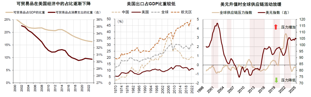 “三碗面”共同驱动美元的周期性波动,此外美元周期还会出现放大和超调,主要源于两个正反馈机制。一是实体视角的正反馈机制。美元升值对全球经济的影响具有显著的非对称性:美元是国际信贷的主要计价货币,他国生产往往需要美元融资,美元走强推高融资成本,压缩全球制造业与贸易,对世界其他经济体带来负面影响。而美国是“消费型”国家,出口占 GDP 的比重远低于欧元区和中国,可贸易品无论在消费还是在生产中的比重都持续下降。美元主导地位持续强化,而美国对全球发展的敞口却在逐渐缩小,美元升值对美国经济的压制小于其他经济体,从而造成结构性不对称。