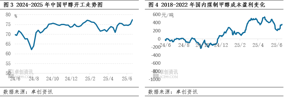 目前主产区装置多运行稳定,甲醇产业开工整体高位,截止到6月19日,中国甲醇整体装置开工负荷为77.44%,较上周期提升2.30个百分点,较去年同期提升6.61个百分点。受宏观等多重因素影响,厂家盈利可观,西北等主产区甲醇企业生产积极性较高。截止到6月19日,西北地区的开工负荷为87.20%,较上周期提升4.69个百分点,较去年同期提升8.71个百分点。但由于前期厂家兑现利润较为积极且部分工厂为达成季度销售任务,积极出货为主,进而导致主产区库存低位。另外部分贸易商前期低价货源基本已消耗完毕,且内地-沿海套利窗口打开,部分内地货源流向港口,内地沿海价格同时上涨。地缘局势导致的市场存在诸多不确定性,贸易商多谨慎观望,持货量相对一般。值得注意的是,近期的甲醇市场更加的情绪化,当情绪根源忽然崩塌,甲醇市场也将慢慢回归供应量相对充足、需求偏弱的基本面。