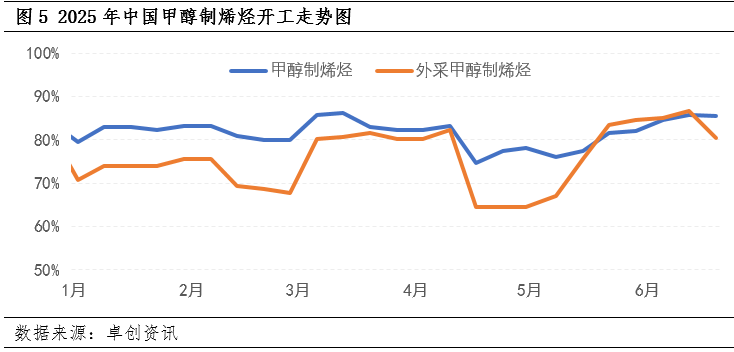 当前传统下游面临较大压力,由于甲醇价格持续走高,下游生产成本攀升,对高价甲醇抵触情绪渐浓,采购多维持刚需。以醋酸为例,上周醋酸开工负荷为92.61%,较上周期下降4.09个百分点。江苏索普等重要装置由于高成本被迫降负。而主力烯烃因其对甲醇的消耗量较大,在高成本的挤压下,利润空间不断压缩,开工积极性较低。目前,南京诚志、浙江兴兴均已降负。截止到6月19日,国内煤(甲醇)制烯烃装置平均开工负荷在85.53%,较上周期下降0.32个百分点。其中外采甲醇的MTO装置产能约1090.5万吨,平均负荷80.46%,较上周期下降6.14个百分点。
