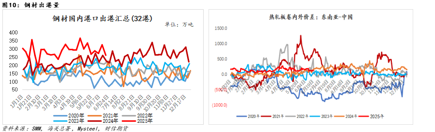 从钢材直接出口角度来看,出口动能仍在,钢材出口或可维持高位。据SMM,25年第25周,32港钢材出港量为260.72万吨,环比下降63.68万吨,32港周度钢材出港量低于25年周均285.84万吨的水平。从内外价差来看,以热卷为代表的内外价差变动不大,出口利润尚存,短期钢材出口或难大幅下降。关注出口持续性。