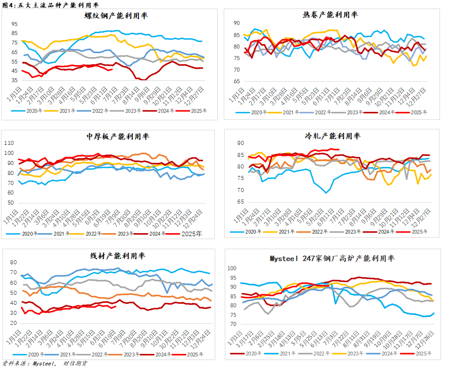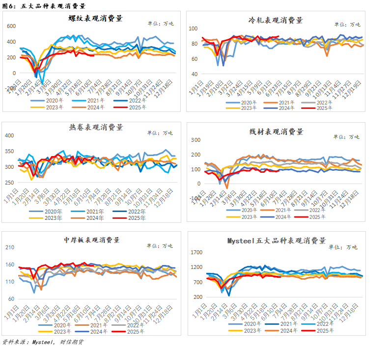 从需求表现来看(以Mysteel五大品种为例),五大钢材品种表需未能延续下降(连续两周下降后有所增加),显示出一定的韧性。从季节性角度来看,建材需求整体处于近6年同期偏低水平,冷轧与中厚板需求维持高位,热轧需求韧性尚存。建材需求淡季来临,后期重点关注淡季需求下降速度(若淡季持续降库,需求偏弱预期或将得到修复)。