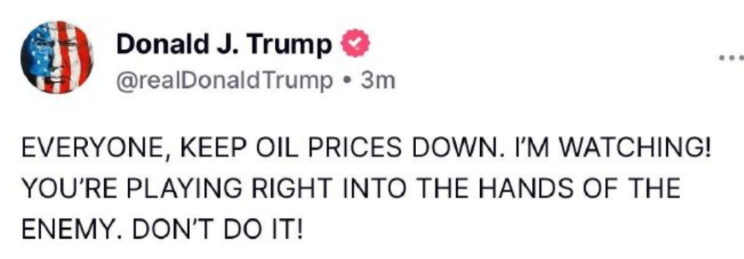 对于大家关注的油价,美国总统特朗普再度发声,其表示,所有人,把油价压下来,我在看着。