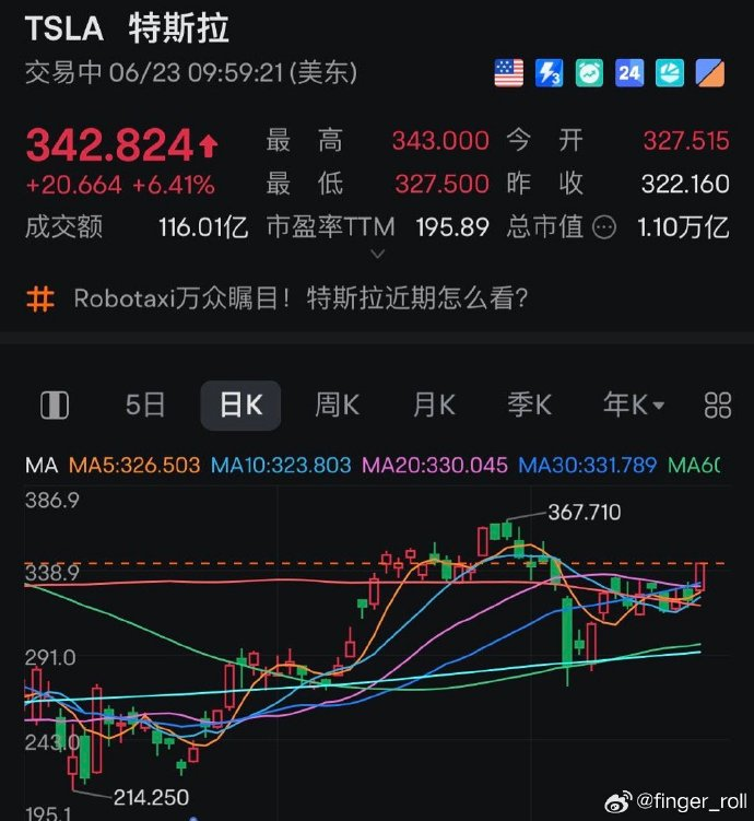 个股方面,特斯拉日内涨幅扩大至5%。当地时间6月22日,特斯拉在得州奥斯汀正式推出无人驾驶出租车Robotaxi服务,10台左右的焕新Model Y作为首批无人驾驶出租车投入使用,开始接送首批乘客。