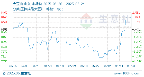 6月24日,生意社大豆油基准价为8394.00元/吨,与本月初(7904.00元/吨)相比,上涨了6.20%。