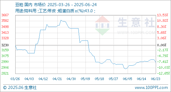 6月24日,生意社豆粕基准价为2986.00元/吨,与本月初(2956.00元/吨)相比,上涨了1.01%。