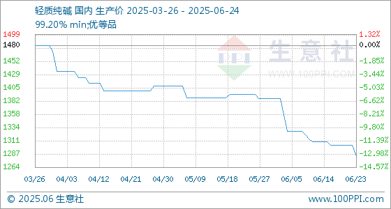 6月24日,生意社轻质纯碱基准价为1284.00元/吨,与本月初(1386.00元/吨)相比,下降了7.36%。