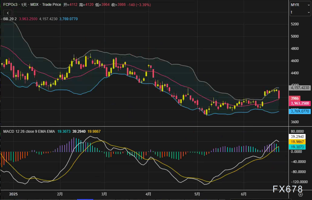 汇通财经APP讯——周二(6月24日),马来西亚衍生品交易所(BMD)棕榈油主力合约FCPOc3重挫3.39%,收报3986林吉特/吨(约合940.09美元),创下自4月4日以来最大单日跌幅。此前连续四日的反弹行情戛然而止,芝加哥豆油与原油价格同步走弱成为主要拖累因素。日线技术指标显示,布林带(20,2)三轨分别位于3963、4157和3769林吉特,MACD(12,26,9)柱状图收窄至19.99,短期动能明显减弱。