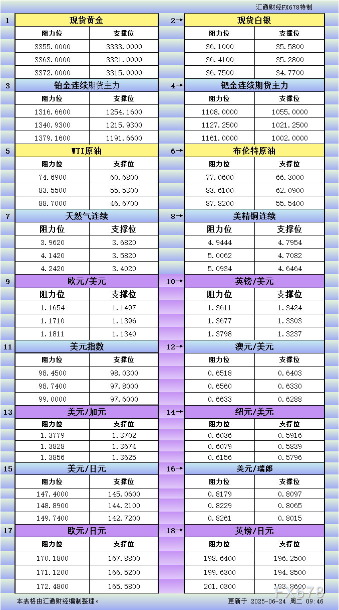 汇通财经APP讯——6月24日亚市更新的黄金、白银、铂金、钯金、原油、天然气、铜(商品)以及:美元指数、欧元、英镑、日元、瑞郎、澳元、加元、纽元(热门货币对)的支撑阻力位一览。