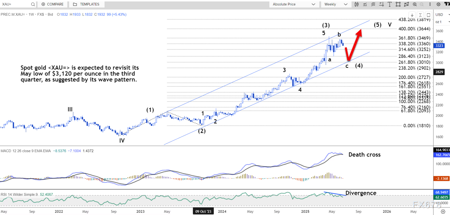路透技术分析师指出,根据其波浪形态显示,现货黄金预计将在第三季度重新回到 5 月份的低点 3120 美元/盎司。