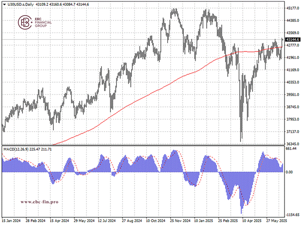 道指已突破200日移动均线,然而MACD顶背离可能会削弱涨势。如果双顶形态出现,该指数可能会重新测试42300附近的低点。