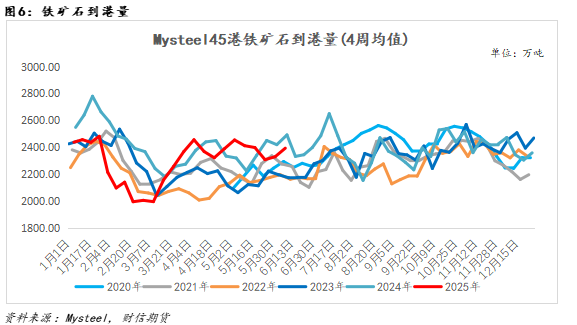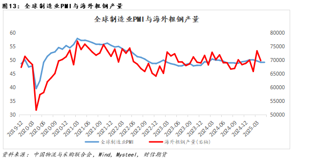 从外需角度来看,海外需求仍待改善,海外铁矿石需求增量或有限(据测算,全球制造业PMI与海外粗钢产量呈正相关性,相关系数在0.66)。据中国物流与采购联合会,5月全球制造业PMI为49.2%,较上月微幅上升0.1个百分点,连续3个月低于50%。基于美国加征关税带来的不确定性影响,经济合作与发展组织最新报告将2025年世界经济增长预期由3.1%下调至2.9%,联合国预测2025年全球经济增速将放缓至2.4%,较1月份的预测值低0.4个百分点。