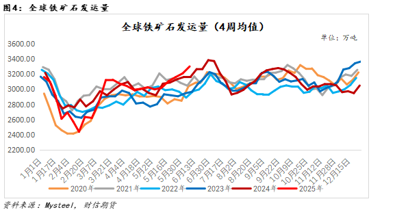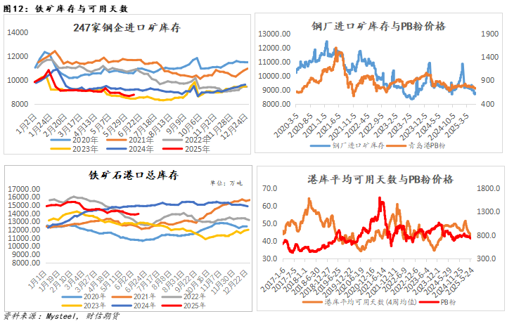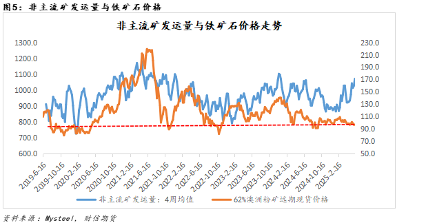 从非主流矿角度来看,利润驱动仍存,非主流矿发运量整体呈现稳中有增态势。据测算,2025年以来,非主流矿周均发运量为964.13万吨,相比24年同期的981.37万吨略有下降,但目前铁矿石普氏指数尚未跌破90美元(非主流矿成本大概在80-90美元),非主流矿山发运大幅下降的可能性仍较小(但需警惕普氏指数跌破90美金后非主流矿发运情况)。