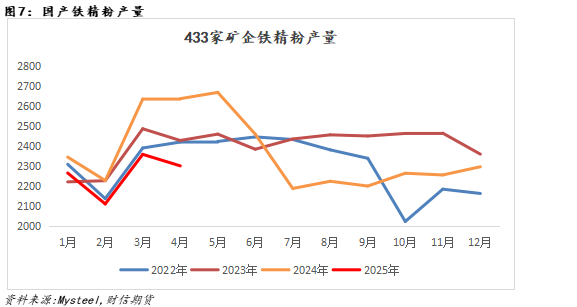 国产矿方面,受多重因素影响,国产铁精粉产量不及预期(这也是铁矿石弱预期一直未能兑现的原因之一)。山西部分矿山推进不积极、安检与环保督察趋严、河北部分矿山面临资源枯竭,国产铁精粉产量兑现不及预期(截至四月底,铁精粉产量同比下降804.3万吨)。