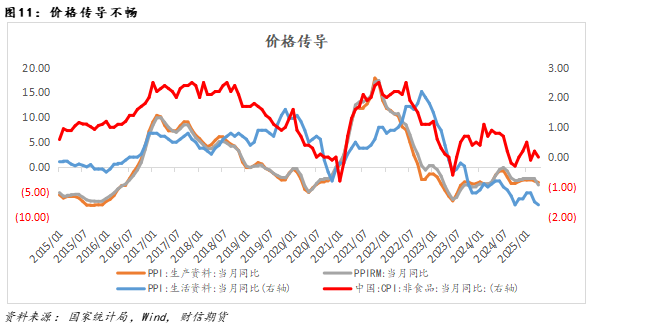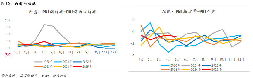 从用钢需求驱动来看,房建资金偏紧态势未改,基建项目资金仍待进一步改善,制造业新订单在赶出口扰动下环比虽有好转,但内需仍偏弱,经济动能仍待提振。据百年建筑数据,截止6月10日,房建项目资金到位率为49.19%,低于50%,且连续两周下滑,非房建项目资金相比房建项目要好,但近期资金到位率有所反复。以PMI新订单指数与PMI新出口订单指数之差来衡量内需水平,5月相比4月有所下降,以PMI新订单与PMI生产指数之差来衡量经济动能,经济动能整体偏弱,仍待提振。事实上,从价格传导角度可验证此点,下游需求不足,非食品CPI整体表现偏弱,难以带动PPI,PPI整体呈现回落态势。
