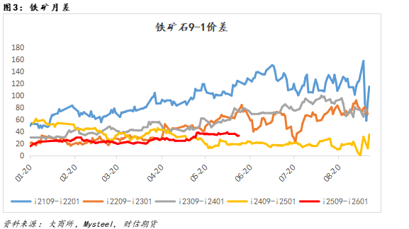 从月差角度来看,目前铁矿9-1价差整体处于略低水平。钢厂补库意愿较低,近月提振力度有限,9-1价差走扩需看到钢厂补库增加。