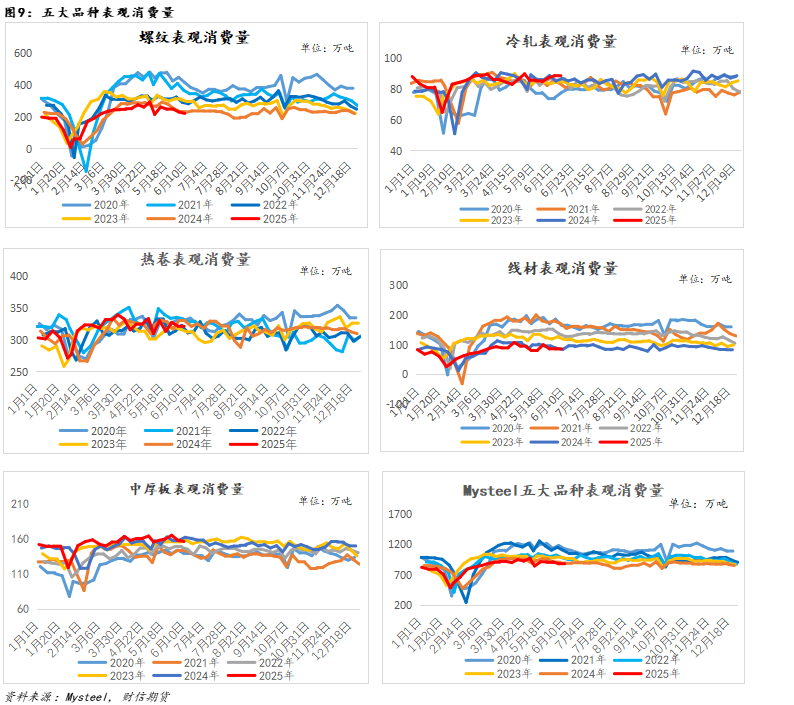从钢材需求角度来看(以Mysteel五大钢材品种为例),建材需求季节性下滑,板材需求略有下降(显示出一定的韧性),钢材整体需求有所下降。后期重点关注季节性淡季时段建材需求下降速度。