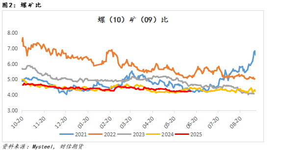 从基差角度来看,铁矿石09合约基差有所走弱,整体处于中性水平;从品种比值来看,螺(10)矿(09)比处于近5年同期偏低水平,相对估值中性略高。
