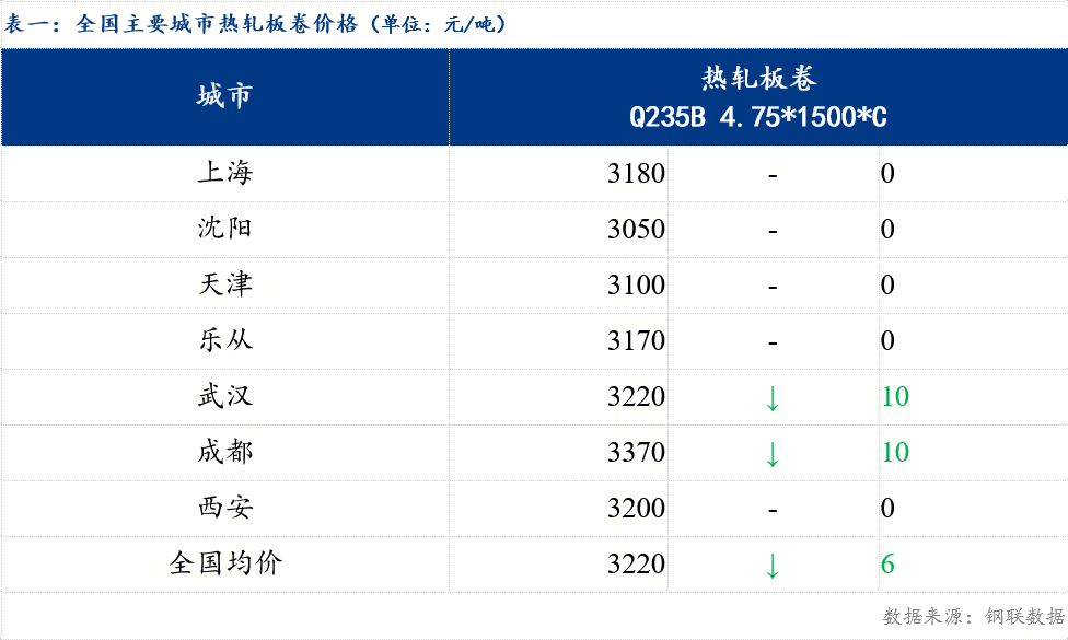 今日热轧板卷全国主要城市价格小幅下跌,截止发稿时3.0mm热轧板卷全国均价3277元/吨,较上个交易日下跌6元/吨。4.75mm热轧板卷全国均价3220元/吨,较上个交易日下跌6元/吨。今日黑色商品期货震荡趋弱运行,热卷10合约收跌0.26%,现货价格主稳个降,市场低价成交为主,整体交投氛围偏弱。
