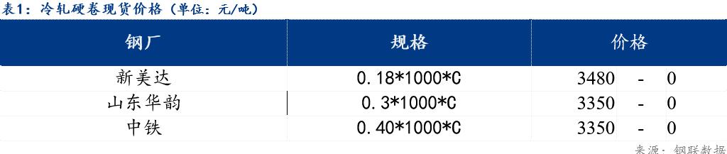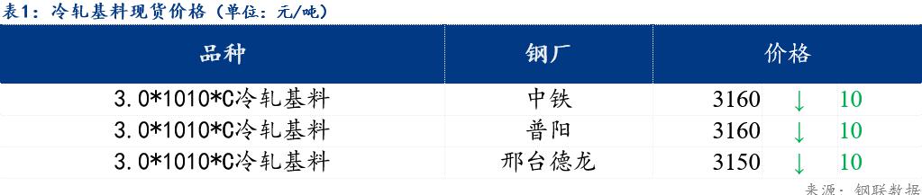 镀锌板卷0.3*1000*C山东华韵报价4130元/吨,价格较上个交易日价格持平;冷轧硬卷0.18*1000*C新美达出厂报价3480元/吨,价格较上个交易日价格持平;冷轧基料3.0*1010*C中铁报价3160元/吨,价格较上个交易日价格下跌10元/吨。