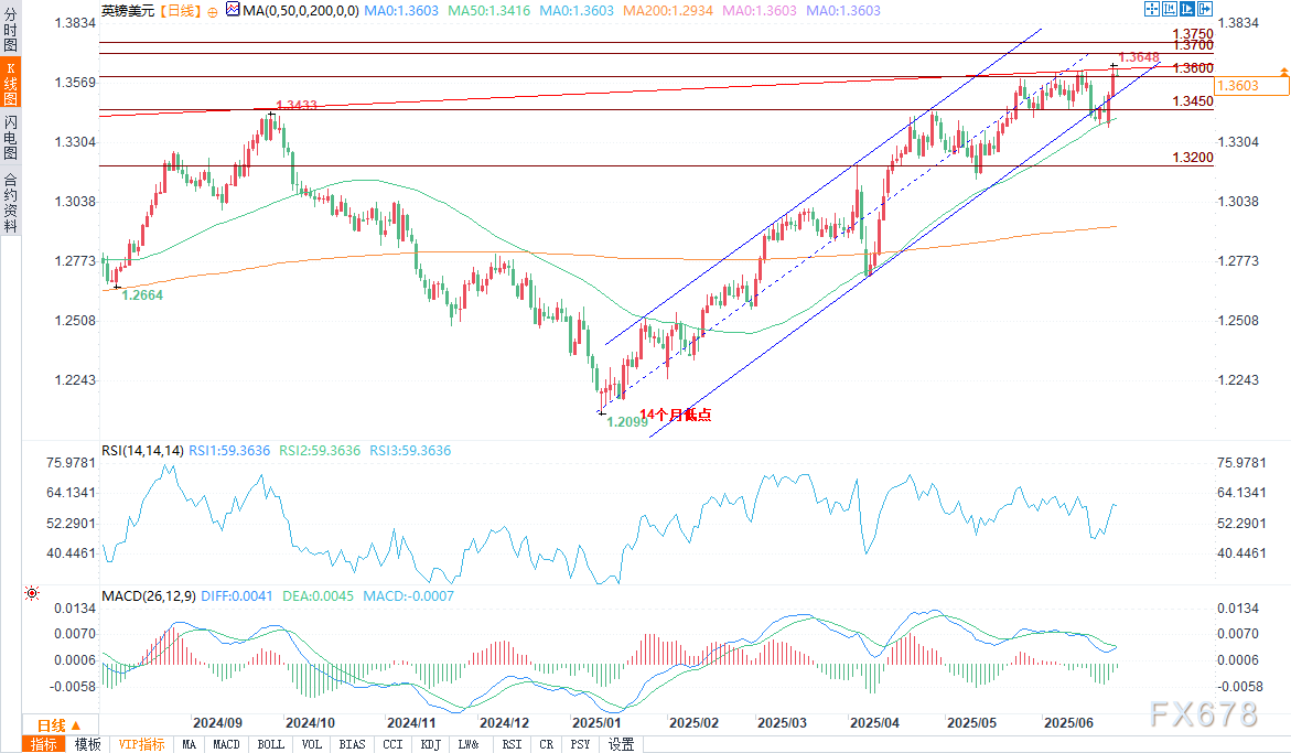 汇通财经APP讯——周三(6月25日)欧盘时段,英镑/美元盘中冲高至1.3633后回落,不过仍维持在1.36上方。昨日,英镑/美元触及1.3648,为2022年2月以来的最高水平。