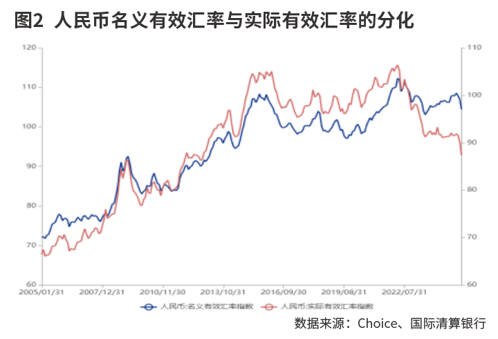 值得注意的是,长期以来人民币名义有效汇率和实际有效汇率的走势基本一致,而且两者的差距较小,但2022年以来两者的差距在扩大,人民币名义有效汇率要明显强于实际有效汇率。
