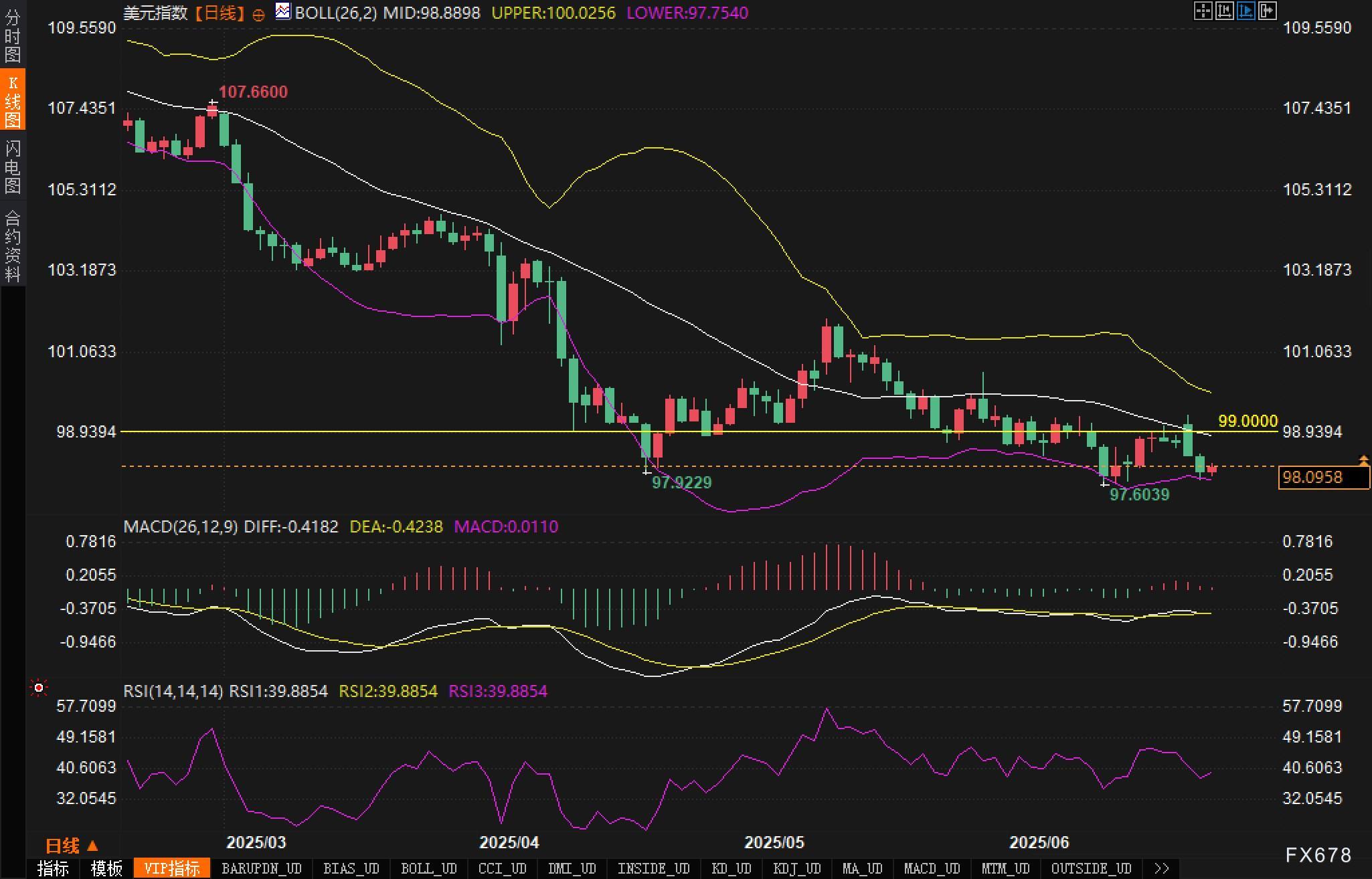 当前价格紧贴布林带下轨97.75,分析认为若跌破97.60支撑,将打开进一步回撤空间,或测试97关口。阻力方面,短期关注99.00整数位与布林带中轨98.89,进一步为100.02(布林上轨)。