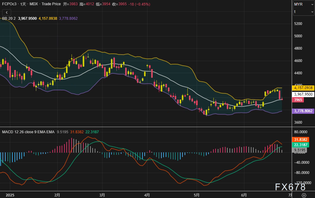 汇通财经APP讯——周三(6月25日),马来西亚衍生品交易所(BMD)棕榈油主力合约FCPOc3收报3963林吉特/吨,日内下跌20林吉特(0.5%)。盘中价格一度试图反弹,但中东局势的不确定性最终拖累市场情绪。技术指标显示,日线布林通道中轨位于4157林吉特,MACD柱状图收缩至22.3,短期动能有所减弱。