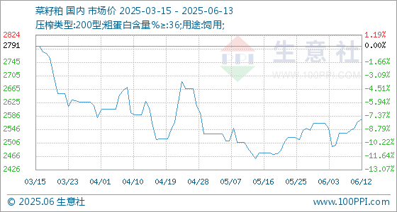 6月13日生意社菜籽粕基准价为2576.67元/吨