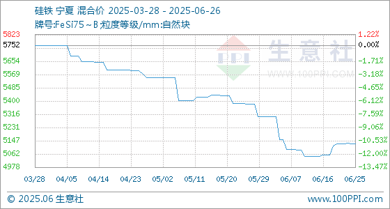 6月26日,生意社硅铁基准价为5125.71元/吨,与本月初(5298.57元/吨)相比,下降了3.26%。