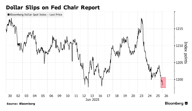 周四美元下跌,此前有报道称,由于认为现任主席鲍威尔在降息问题上行动过于迟缓,特朗普正考虑提前宣布下一任美联储主席提名人选。