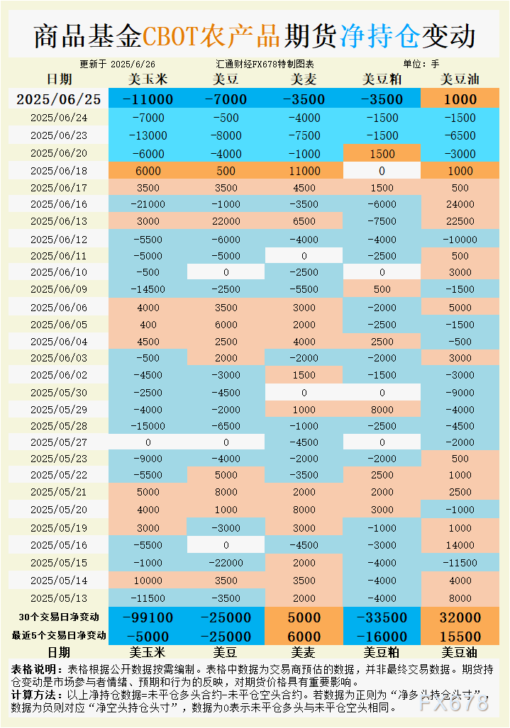 增加CBOT玉米投机性净空头;增加CBOT大豆投机性净空头;增加CBOT小麦投机性净多头;增加CBOT豆粕投机性净空头;增加CBOT豆油投机性净多头。