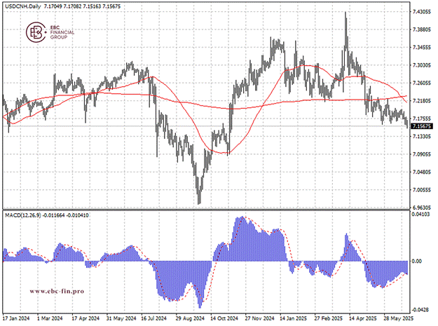 人民币在一周前形成金叉后持续上涨,然而MACD顶背离表明可能会出现回调。短期内可能会重新测试7.1785。