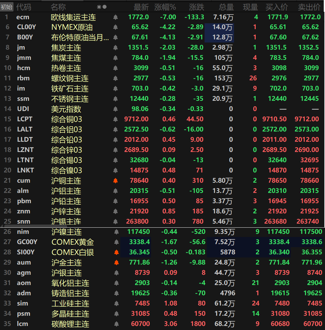 此外,碳酸锂主连午后开盘快速拉涨,收盘涨幅高达3.06%,工业硅涨1.08%,多晶硅涨0.48%。欧线集运主连跌7%。