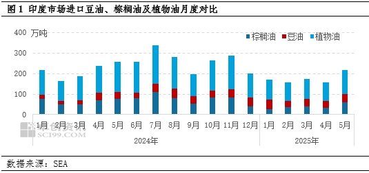 【导语】 作为世界头号食用油进口国的印度,2025年5月进口豆油环比增加10.4%,达到今年1月以来的单月最高水平,同时棕榈油进口量环比激增84%。因印度国内价格偏高,为了平衡市场,印度政府降低食用油进口关税,此举或将继续刺激国内增加进口量,进而将导致6月中下旬豆油价格持续回落。