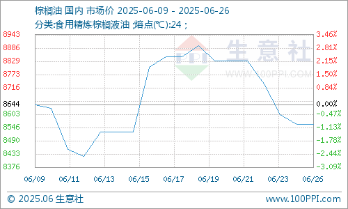 月底,天气炎热,国内油脂需求下滑,棕榈油行情上涨过后迎来回调,截止6月26日,棕榈油市场均价跌至8560元/吨,价格下跌超200元/吨。