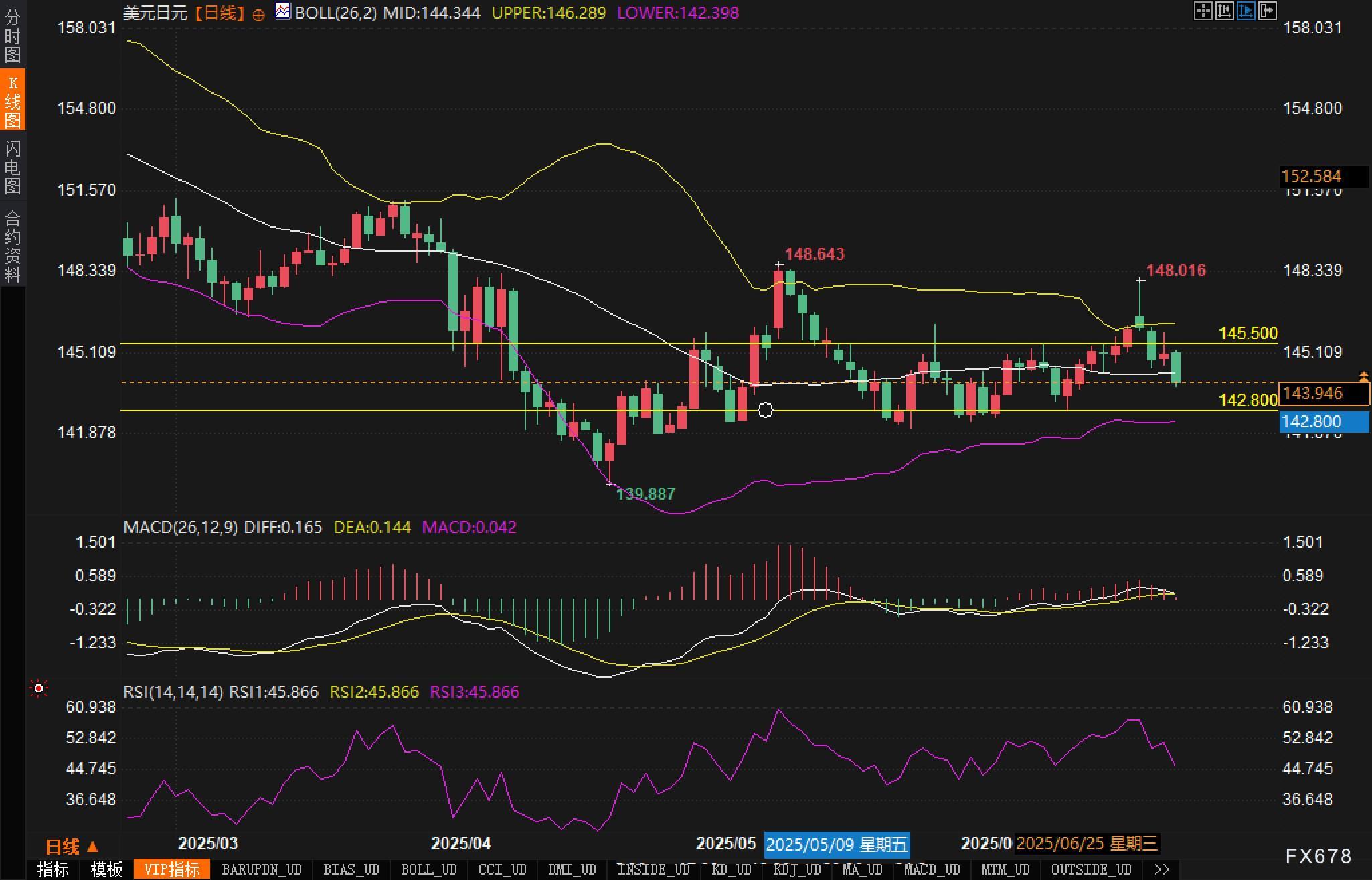 汇通财经APP讯——美元兑日元汇价近期自146.00关口大幅回撤,6月26日(周四)盘中跌破144.00整数位,创近一周半新低。当前走势延续空头趋势,结合基本面与图形结构,短线下行压力不减,市场正密切关注即将公布的美国PCE物价指数以及东京CPI数据,以寻找下一阶段指引。