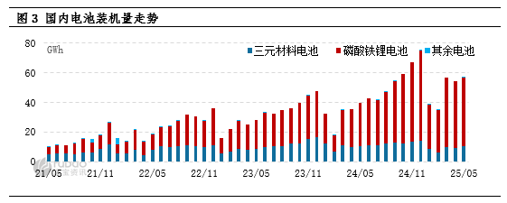 不锈钢板块发展详情可关注不锈钢相关报告,在此不过多赘述。新能源板块作为镍需求的新兴领域对镍消费有着至关重要的作用。伴随动力电池高镍化趋势加速,三元材料中镍占比升至80%以上,固态电池镍箔需求增长(减重30%),但三元材料电池的增速并不及其他电池,这会成为镍需求改善的壁垒。数据显示,2025年1-5月国内三元材料电池装机量在44.7 GWh,同比去年同期减少6.4 GWh,跌幅为12.52%,同时2025年1-5月三元材料电池装机量占总装机量的18.70%,较去年同期的32.73%下滑14.03个百分点。