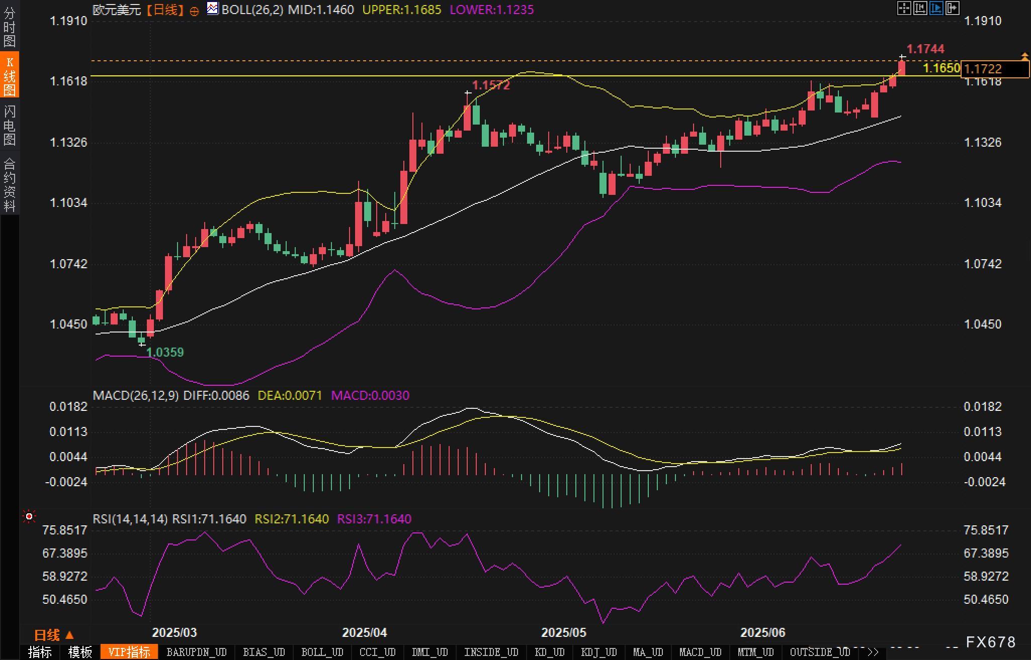 目前蜡烛图实体强劲,上穿布林上轨(1.1685),形成有效突破。今日最高点1.1744创下近三年新高,分析认为若能收于该水平之上,汇价将有望进一步打开上行空间。短期支撑见于前高阻力转支撑位1.1650,下一关键阻力关注1.1820-1.1850区间。