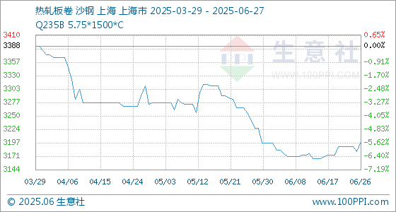 6月27日,生意社热轧板卷基准价为3200.00元/吨,与本月初(3196.67元/吨)相比,上涨了0.10%。