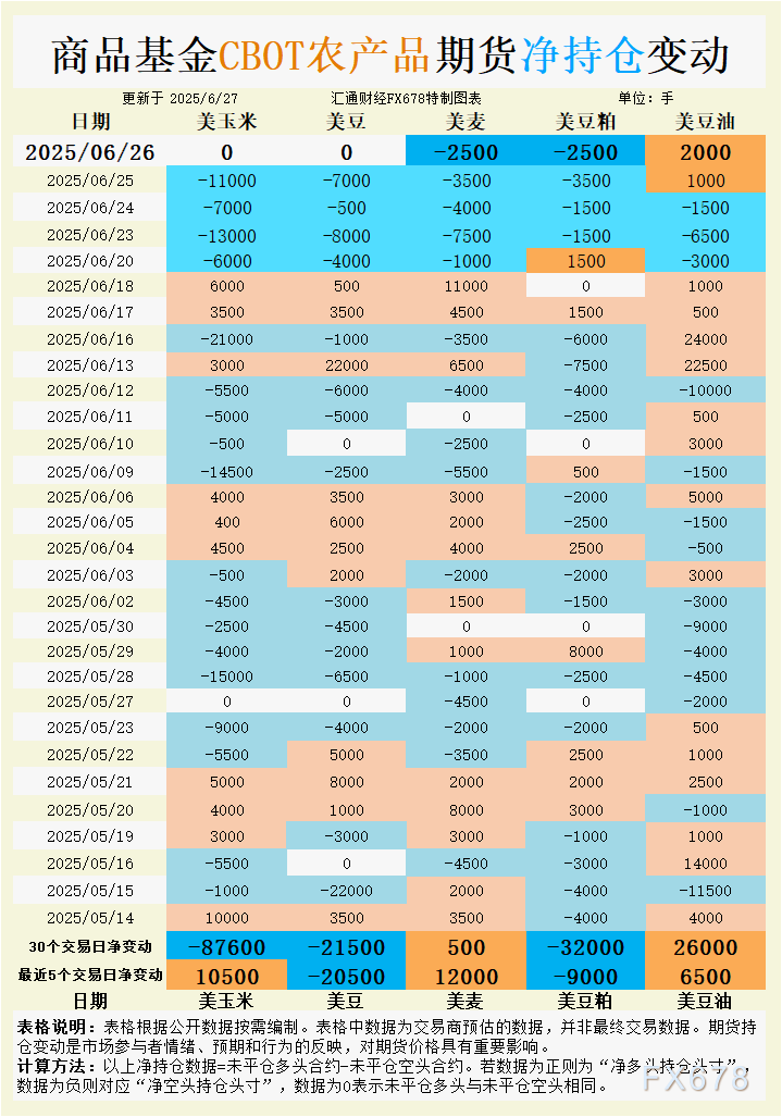 增加CBOT玉米投机性净空头;增加CBOT大豆投机性净空头;增加CBOT小麦投机性净多头;增加CBOT豆粕投机性净空头;增加CBOT豆油投机性净多头。