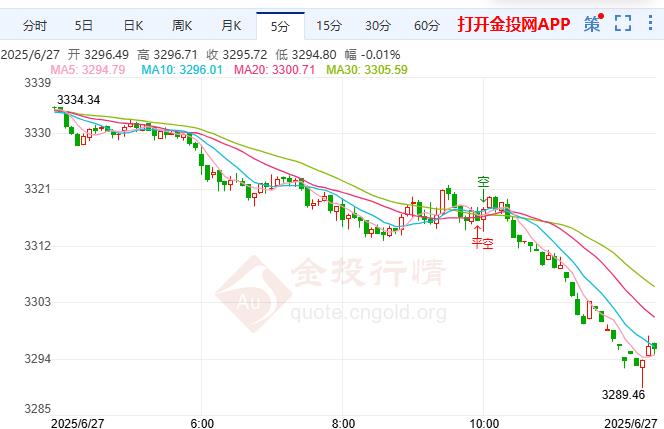 周五(6月27日)亚市盘中,伦敦金价格短线急跌,目前位于3298.90美元/盎司,跌幅0.86%,今日金价开盘报3327.55美元/盎司,最高上探3328.16美元/盎司,最低触及3289.09美元/盎司。