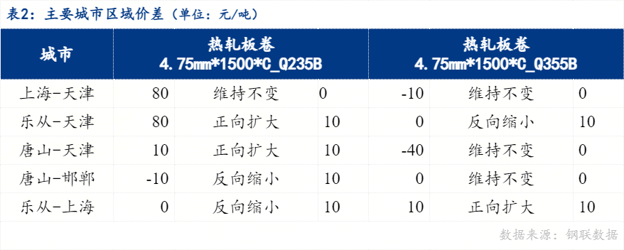 从区域价差来看,4.75mm普卷华南与华北价差80元/吨,华东与华北价差80元/吨,华南与华东价差0元/吨。京津冀地区价差来看,唐山与天津价差10元/吨,唐山与邯郸价差-10元/吨 。