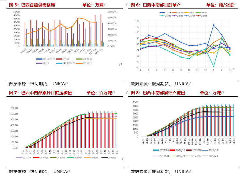 总体来看,5月份压榨量和制糖比的飙升给市场带来悲观情绪,但累计产量缺口、甘蔗质量低迷及乙醇价格的不确定性仍给年度产量带来不确定性,后期需重点关注圣保罗州单产修复进度、ATR值回升幅度及糖醇价差波动,以及6月降雨和霜冻风险增加对收割进度的影响。目前部分机构下调了甘蔗压榨量的预估,预估区间大多在5.8-6.1亿吨之间,而鉴于制糖比例创新高,市场对糖产量的预估仍维持在3950-4200万吨之间。