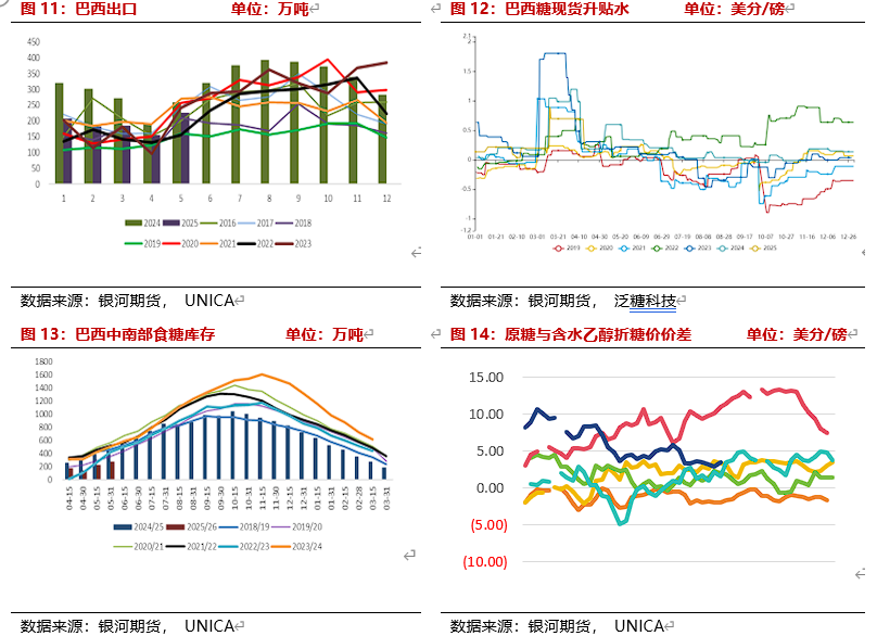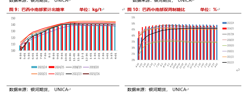 当前巴西25/26榨季压榨开启,市场普遍认为巴西糖产小幅增产。5月下半月,巴西中南部地区甘蔗入榨量为4784.2万吨,较去年同期的4536万吨增加248.2万吨,同比增幅5.47%;甘蔗ATR为124.87kg/吨,较去年同期的130.15kg/吨减少5.28kg/吨;制糖比为51.85%,较去年同期的48.2%增加3.65%;产乙醇20.57亿升,较去年同期的21.23亿升减少0.66亿升,同比降幅3.12%;产糖量为295.1万吨,较去年同期的271.1万吨增加24万吨,同比增幅达8.86%。2025/26榨季截至5月下半月,巴西中南部地区累计入榨量为12476.8万吨,较去年同期的14153.9万吨减少1677.1万吨,同比降幅达11.85%;甘蔗ATR为117.02kg/吨,较去年同期的122.06kg/吨减少5.04kg/吨;累计制糖比为49.99%,较去年同期的47.81%增加2.18%;累计产乙醇57.4亿升,较去年同期的64.76亿升减少7.36亿升,同比降幅达11.36%;累计产糖量为695.4万吨,较去年同期的787万吨减少91.6万吨,同比降幅达11.64%。