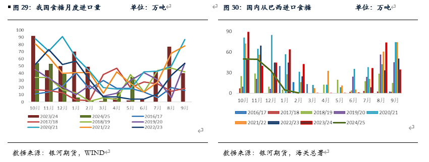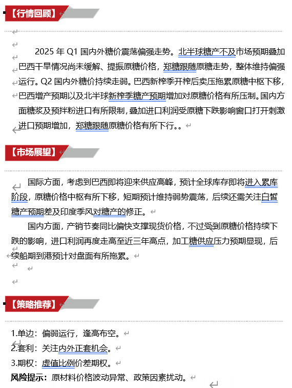 2025年Q1国内外糖价震荡偏强走势。北半球糖产不及市场预期叠加巴西干旱情况尚未缓解、提振原糖价格,不过考虑到印度减产对全球食糖贸易流影响相对有限,原糖上方空间存在压力。郑糖跟随原糖走势,整体维持偏强运行。Q2国内外糖价持续走弱。巴西新榨季开榨后卖压拖累原糖中枢下移,巴西增产预期以及北半球新榨季糖产预期增加对原糖价格有所压制。国内方面糖浆及预拌粉进口有所限制,叠加进口利润受原糖下跌影响窗口打开刺激进口预期增加,郑糖跟随原糖价格有所下行。