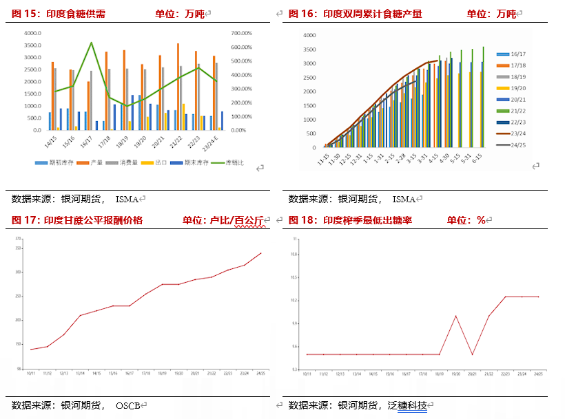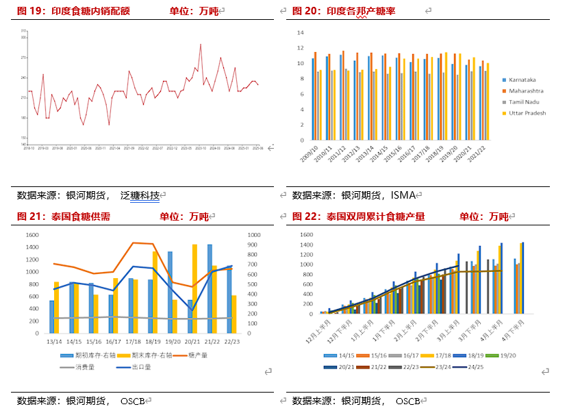 印度受天气影响预计本榨季将提前收榨,24/25榨季产量预估在2600万吨左右,但6月的销售配额为230万吨,低于去年同期的255万吨,本榨季截至6月的累计销售量同比减少了145万吨,需求低于预期,预计本榨季的国内总消费量由上榨季的2890万吨降至2800-2850万吨。此外,目前市场对本榨季印度的出口量预期在70万吨左右,亦低于100万吨的配额总量。国内消费需求减弱及出口减少令本榨季的结转库存减幅小于预期,约为500-550万吨。