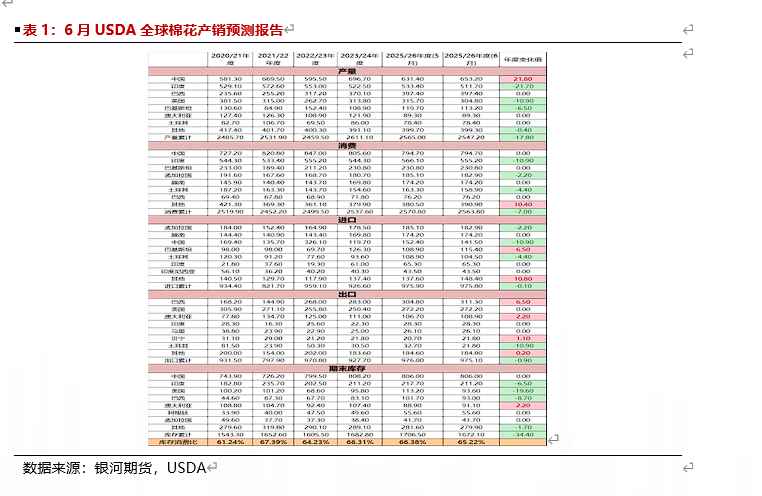 25/26年度全球供应、消费均有所下调,其中全球棉花总供应下调17万吨至2547;总需求下调7万吨至2563万吨,均处于历年中位,预计全球棉花供需矛盾不明显。